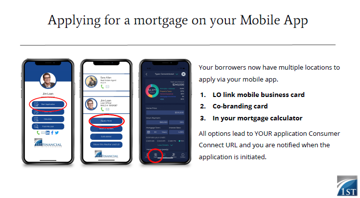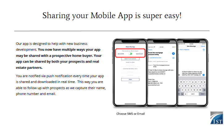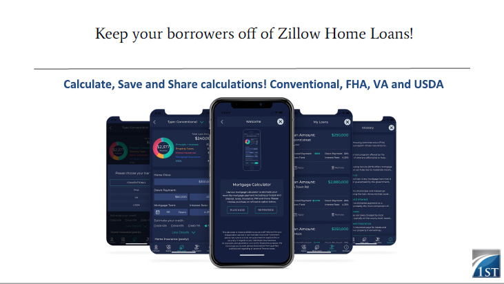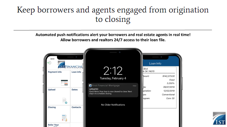 1ST FINANCIAL has introduces it's first phone application. The use of the app allows you and your clients to follow the loan process throughout the life cycle of the loan, real time access to updated loan information and the ability to effectively and efficiently communicate with your borrowers and real estate agents.